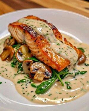 Лосось з часниковим маслом зі шпинатом і грибами у кремовому соусі