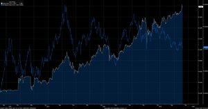 Прибутковість JGB зростає, а дохідність у США падає. Вони розходяться, бо ризик інфляції знижується у США порівняно з Японією на 2 місяці.