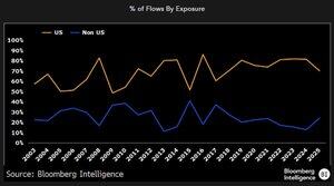 Велика ротація, яка не була... ось відсоток потоків ETF, який історично захоплювався США та міжнародними. невеликий підйом, але все ще нижчий за довгостроковий середній показник і далеко не порівняно з GFC чи хеджованим трендом, незважаючи на найкращі результати EFA за останній час. Інвестори просто не повірили наративу «Продай Америку», яку їм нав'язували колумністи та економісти. На мою думку, це може бути *головна* історія року (хоча попереду ще 5 тижнів)