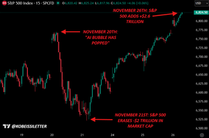 Не продавайте страху: 20 листопада з'явилися широкі виклики про те, що «штучний інтелект» лопнув. Станом на 21 листопада S&P 500 стерла ринкову капіталізацію на -$2 трильйони. Сьогодні, всього через 3 торгові дні, індекс S&P 500 піднявся на +300 ПУНКТІВ від мінімуму. А ринкова капіталізація S&P 500 зараз на +$600 мільярдів ВИЩА, ніж була 20 листопада, коли «луснула ШІ-бульбашка». Ті, хто піддався страху, залишаються позаду. Володіти активами або залишатися позаду.