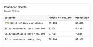 [52,4% отримувачів airdrop Monad продали або передали всі токени] За @Adam_Tehc статистикою, 39 796 гаманців (52,4%) із 76 021 гаманця, які отримали @monad airdrop, були продані або передані; 27 133 гаманці (35,7%) досі повністю зберігаються; 5 728 гаманців (7,5%) було продано/переведено більш ніж на 50%; 3364 гаманці (4,4%) було продано/передано менше ніж 50%.