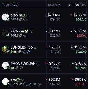 Топові монети Pumpfun за останню 1 годину за обсягом: $Pippin $Fartcoin $Jungleking $Phonewojak $Arc 🤖: