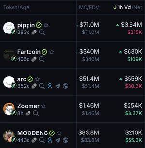 Топові монети Pumpfun за останню 1 годину за обсягом: $Pippin $Fartcoin $Arc $Zoomer $Moodeng 🤖: