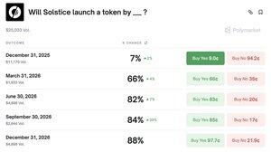 Загальна думка така: @solsticefi буде TGE у першому кварталі 2026 року з 66% шансами Polymarket на запуск токена до 31 березня Цікаво, що між коефіцієнтами червня та грудня майже немає різниці Ймовірно, краще купити грудневі акції, оскільки різниця у виплатах невелика, тож можна обрати пізнішу дату Вересень теж підскочив на 20%, тож тримачі пакетів там добре поїли (хоч і невеликий обсяг).