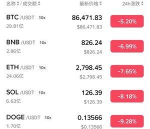 Bitcoin (BTC) впав до $86,000 (зниження на 5-6%), а Ethereum (ETH) — до $2,823 (зниження на 6-10%).