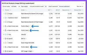 Усі три варіанти FLUX.2 входять до топ-10 таблиці лідерів Artificial Analysis Image Editing Leaderboard, при цьому [flex] і [pro] випереджають GPT-5 та попереднє покоління FLUX.1 Kontext