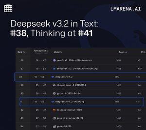 🚨BREAKING: Текстове оновлення таблиці лідерів 🐳 Deepseek-v3.2 входить у таблицю лідерів на #38, а Deepseek-v3.2-thinking — на #41. Для порівняння, попередні версії займали вищі позиції: 🔹 v3.2 займає #38 (–5 очок проти 3.1 і –14 очок проти 3.2-exp) 🔹 v3.2-мислення займає #41 місце (–7 очок проти v3.1-мислення та –5 балів v3.2-exp-thinking) Обидві моделі демонструють найбільші прирости у Legal за рангом: покращення на +28 балів для v3.2 і +19 балів для версії 3.2 порівняно з попередниками v3.1. Найбільше падіння спостерігається у сфері охорони здоров'я, де v3.2 знизився на 25 пунктів. Де v3.2 працює найкраще (серед відкритих моделей): 🔹 #1 у математиці та праві 🔹 Топ-10 у мульти-поворотах, медіа та бізнесі Де мислення v3.2 працює найсильніше (серед відкритих моделей): 🔹 #1 у науці 🔹 Топ-5 у юридичній галузі Ці оновлення відображають постійну роботу @deepseek_ai з розширення та вдосконалення сімейства відкритих моделей.