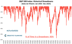 Індекс S&P 500 у 92% випадків перебуває у стані спаду. Кожна крапля має свою сюжетну лінію «кінця світу». Але ринкам не потрібна досконалість, щоб піднятися вище — достатньо зростання прибутків і час. Повернення — найнадійніша частина історії.