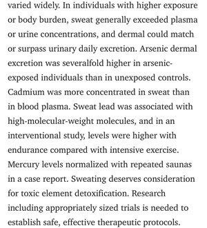 Кожен токсин, який я стверджував, що можна знизити через потовиділення в цій темі, має літературу, і єдина суперечлива — це PFAS (хронічні хімікати). Вони ефективно видаляються під час донорства крові, їх виявляють у поті, а деякі видаляють у поті, але більшість із них прив'язані до того, що білки не можуть бути ефективно видалені потом. Тобто, по суті, піт — це метод усунення, але не вважається дуже ефективним шляхом