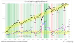 Nhìn vào chỉ số S&P 500 được cân bằng theo trọng số, chúng ta thấy một thị trường đang nằm ngay trên đường xu hướng tăng của nó (chỉ thiếu một chút để đạt mức cao mới), với khoảng hai phần ba thị trường nằm trên đường trung bình động của họ. Trong khi đó, tỷ lệ P/E tương lai được cân bằng theo trọng số là 18.3x, cao hơn một chút so với trung bình 17x. Nhìn vào biểu đồ này, tôi không thấy một thị trường nào đang vượt quá khả năng của nó.