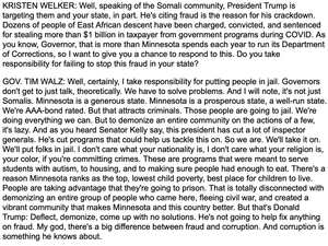 Thêm thông tin về vụ bê bối gian lận Somali ở Minnesota. NBC đã có thống đốc Minnesota trong chương trình hôm nay và, không giống như CNN, thực sự đã đề cập đến câu chuyện này. Thống đốc Walz thừa nhận không có lỗi--'Tôi chịu trách nhiệm về việc đưa người vào tù'--và cố gắng đổ lỗi cho Trump.
