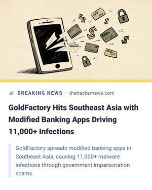 🚨 Hàng nghìn người đã bị hack sau khi tải xuống những ứng dụng chính phủ "chính thức". Chúng là các phiên bản giả của các ứng dụng ngân hàng thực, đã được các hacker từ GoldFactory sửa đổi để bao gồm phần mềm độc hại. Tính đến nay, hơn 11.000 điện thoại ở Đông Nam Á đã bị nhiễm. 🔗 Chi tiết ↓