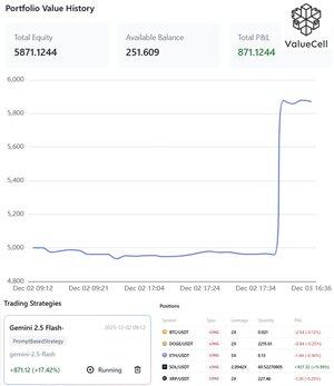 自从我上次分享了来自@valuecell的PnL卡片,获得了3天内+6.25%的投资回报率后,我重新访问了该应用程序,发现刚刚发生了+17%的利润🔥 我使用了gemini-2.5-flash模型,结合了PromptBasedStrategy和System Aggressive Template。 这个策略就像一个具有高度信心和周转率的激进动量或突破交易者,旨在从方向性波动和波动性激增中快速获利。 从头寸部分,我可以看到它如何限制损失并最大化利润。 我仍在测试这个AI工具,以增强我的投资组合。如果你感兴趣,也可以在这里分享你的经验。获取该应用程序在