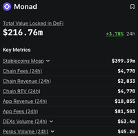 自$MON主网启动以来已经过去两个多星期。 以下是@monad的当前状态 ↓ - $216M TVL - $400M 稳定币市值 - 4K 链费(24小时) - $80K 应用费用(24小时) - $63M DEX 交易量(24小时) - 66K 活跃地址(24小时) - 实时TPS:~20 - 区块时间:~400毫秒 $MON的价格比TGE价格高出约5%,市值保持在$2.6B FDV以上。 老实说,这些数据对于2025年一个全新的L1来说是好还是坏?