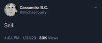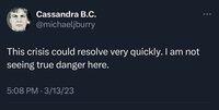 2023年1月31日 - 我发推文“卖出” 银行危机随之而来,银行倒闭。人们感到恐慌,股市下跌。 2023年3月13日 - 我发推文“这场危机可能会很快解决。我没有看到真正的危险。” 2023年3月30日 - 我发推文“我说卖出是错的。” /meme corrected
