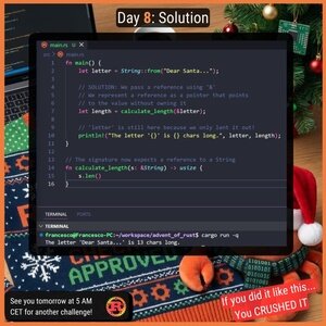 🎄Rust的到来🦀第9天 黄金法则:可变引用。 你可以有多个读者,或者一个写者。 绝不要同时有两者。 在数据竞争发生之前解决它。 1️⃣查看下面的图片。 2️⃣完成后,回复一张截图。 解决方案今天发布,下午5点CET 祝你好运!