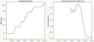 所以在谈了这么多小时的AI之后,在最后的五分钟里,我要谈的是: 马。 发动机,蒸汽机,发明于1700年。 接下来是200年的稳定改进,发动机每十年提高20%。 在这120年的稳定改进中,马完全没有注意到。 然后,在1930年到1950年之间,美国90%的马消失了。 发动机的进步是稳定的。与马的等价性是突然的。