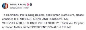 突发:特朗普总统表示,任何飞机都不应飞越或靠近委内瑞拉,整个空域已完全关闭。