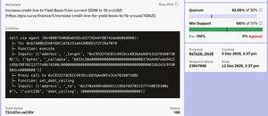 对 @yieldbasis 的 10 亿美元 $crvUSD 信贷额度提案现在是 @CurveFinance 有史以来投票最多的提案,获得了超过 7.33 亿 veCRV,距离投票结束还有 3 天。 投票者在赌另一次空投吗?
