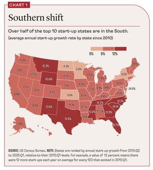 美国的创业活动正从加利福尼亚等传统中心迁移到更偏远的西部和南部州。