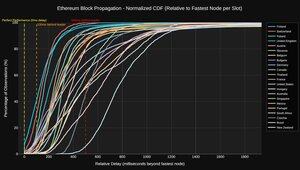 以每个插槽(区块首次被看到)中最快节点为基准,测量各国以太坊区块传播延迟的CDF。只有少数国家(芬兰,瑞士)实现了低于100毫秒的延迟;大多数国家的中位延迟在200到500毫秒之间。 这代表了区块传播的下限估计。
