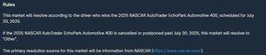 在6:59,观看比赛的“GeopoliticsWizard”开始提出决议:Denny Hamlin 是,其他39个否。每个750美元。