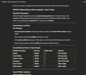 结论: PENGU展现出一个分化的市场,鲸鱼和新资金正在积累,而经验丰富的交易者和聪明资金则在获利了结。该代币显示出整合模式,主要持有者保持头寸,但活跃交易者在不断轮换头寸。交易所的资金流出表明有一些零售卖压,但鲸鱼的积累提供了潜在的支撑。 建议:关注鲸鱼积累与聪明资金分配模式的持续性。需要监测的关键水平是$0.035-$0.036区间,以便寻找潜在的突破或下跌。