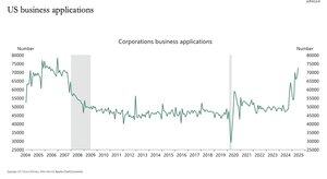 阿波罗的斯洛克表示,美国仍然是世界上最具活力的经济体——他用一张简单的图表来说明这一点:新商业申请的数量。