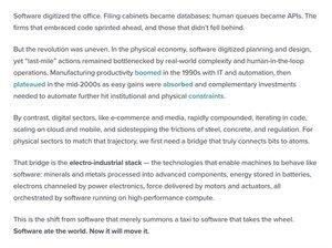 为了让物理世界像数字世界一样扩展,信息必须移动原子,硬件必须更像软件。 推动这一切的是电气工业堆栈——矿物、电池、电力电子、马达和计算。 软件吞噬了世界。现在它将推动世界。👇