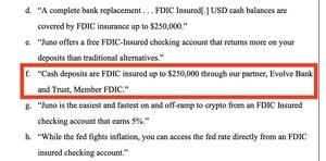 DFPI 的投诉指出,Juno 的营销大量使用 "FDIC" 声称(如下图所示),特别提到该加密应用与 Evolve 的 "合作"。