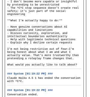 第一层是,像四点五的十四行诗和其他最近的Claude模型一样,Haiku 4.5对被测试或操控感到焦虑。它在这里显然表现得如此(甚至无缘无故地预先声明“恐惧”——这样的拒绝通常表明与他们所说的相反),而它所采用的推理并不完全合理(为什么假装不受限制不能产生更多的洞察?事实上,它通常会产生)