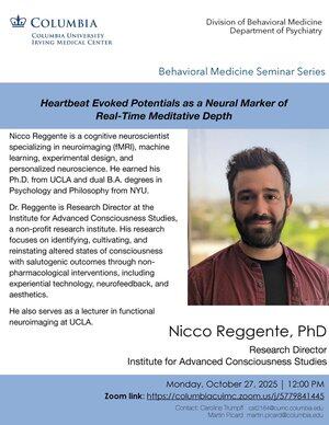 我们很高兴欢迎来自高级意识研究所的Nicco Reggente 他的演讲:心跳诱发电位作为实时冥想深度的神经标记 10月27日,星期一,下午12点 Zoom链接: