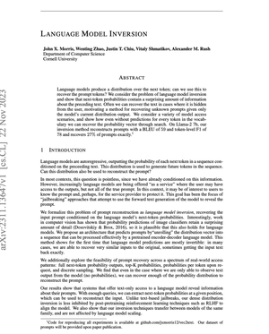 引用的论文添加了一些复杂的扩展,但“语言模型反转”(Morris 等人,ICLR 2024)首先做到了:)