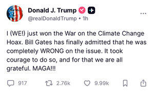 特朗普刚刚赢得了气候变化战争。 比尔·盖茨承认他在所有事情上都是错的。 马克·卡尼的代际预算和绿色补贴刚刚燃起了熊熊大火。🔥