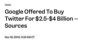想象一下,如果拉里和谢尔盖买下了推特,而不是在 Google+ 上花费大量资金,脸书将会有一个资源丰富的巨大竞争对手。