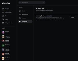 Myriad Markets 秘密提示: 启用 "自动支付燃气费" 设置 > 高级 > 启用 当您的赞助限额达到时,跳过钱包批准。您将使用安全会话密钥从您的钱包自动支付燃气费。 感谢 Abstract,消除了每次签署交易的麻烦。