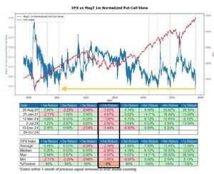 高盛:在本周财报发布之前,Mag7 复合体的看涨/看跌偏斜首次自去年12月以来出现反转(即看涨期权的隐含波动率高于看跌期权)。 这一现象仅发生过几次。这一变动意味着投资者在持续上涨的预期下,明显偏向于看涨。历史上,这种低偏斜读数往往与短期整合或反转相吻合,因为乐观情绪达到顶峰(见图表/数据)。