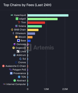 🔥 现在:Hyperliquid 在过去24小时内的费用中位居所有链之首,其次是 edgeX 和 Tron。