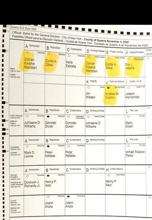 一位朋友发布了他在纽约市的实际选票。Zohran 出现了两次,Sliwa 出现了两次,而 Eric Adams 尽管已经退出,仍然在选票上。 纯粹是巧合,所有 4 个异常都对 Cuomo 造成了伤害——因此帮助了 Zohran。