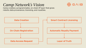 GAIB 正在将 IP 转变为金融资产 在 Camp 确保所有权的同时,GAIB 提供了资助生成具象数据所需的金融基础设施。 GAIB 通过支持部署硬件并在现实世界中收集数据的机器人公司来资助具象数据的生成。 GAIB 的模型建立了一个持续的价值循环: 🔸资本资助数据生成 🔸运营商收集并许可具象数据 🔸投资者从数据驱动的收入中获得回报 这一机制将机器人数据转化为一种有收益的现实资产。