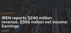 比特币矿工转型为人工智能工厂的 @IREN_Ltd (纳斯达克: $IREN) 周四报告了其2026财年第一季度的收入为2.403亿美元,净收入为3.846亿美元。 该公司表示,调整后的EBITDA为9170万美元。它报告的EBITDA为6.627亿美元,其中包括未实现的收益。