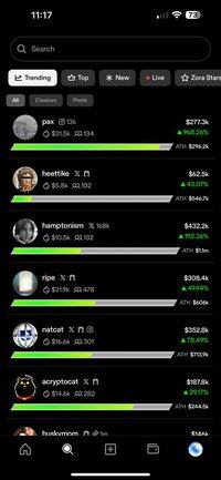 这个应用在过去两周中升级了。 查看谁在直播,私信你持有的创作者,通过交易动态发现新内容,看看探索中什么是热门。通过ATH条获取市场的实时脉搏。 哦,顺便说一下,这一切都在一个简单而强大的$zora飞轮中进行。