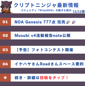 クリプト忍者最新信息11/11版 ⏤⏤⏤⏤⏤⏤⏤⏤⏤⏤⏤⏤⏤⏤⏤⏤⏤ ①NOA Genesis 777点 完售🎉🎉 ②Musubi v4活动报告note公开 ③【预告】摄影比赛举办 ④イケハヤ先生与Road先生的空间摘要 以下,各种信息来源继续🔽 一直以来💖🔁感谢您!!