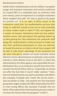 关于“基于证据”的政策:在评估界,有一个公开但肮脏的秘密,那就是随机化过程并不像许多研究所表明的那样受到良好控制……有时,进行随机化的非营利组织工作人员会确保他们偏好的参与者或地点被选中,或者调整过程,以便那些他们怀疑能够更好地利用治疗的客户能够获得治疗。