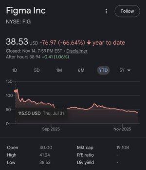 Figma 股票自 IPO 以来下跌了 68%。 — 估值:约 190 亿美元(17 倍收入) — 年经常性收入:11 亿美元,年增长 38%,净留存率 131% — 10 亿美元的股票,占公司 5%,在 IPO 时归属 晚期私营公司的确有充分理由保持这种状态。 公开市场非常残酷。