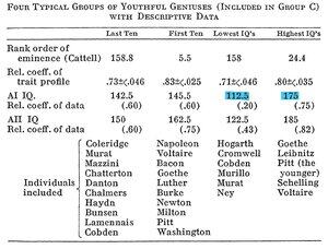 我在阅读特曼的《天才的遗传研究》,其中一个最有趣的事情是,许多天才并没有被分类的专家认为是那么聪明。 最高的IQ组平均约为175,而最低的IQ组平均约为113。