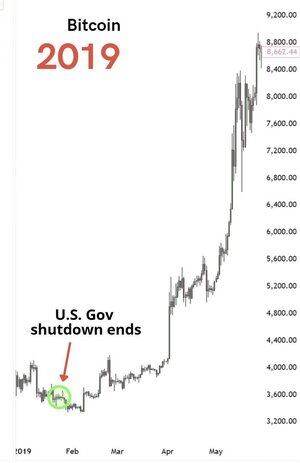 在2019年政府关门结束后,Bitcoin 在4个月内进行了整合,然后开始暴涨。