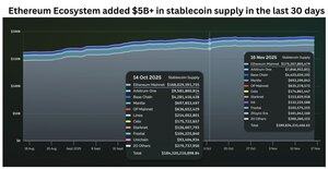 尽管市场条件不佳,@ethereum 生态系统中的稳定币供应仍在持续增长,在过去30天内增加了超过50亿美元。$ETH