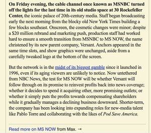 我为@semafor撰写的关于MS Now发布的文章。到目前为止的策略: - 新的播客 - YouTube解说,"同步直播"在YT上 - 全国范围内的MS Now现场活动 - 付费订阅产品 - Pablo Torre的扩展角色 - 合作,与Crooked Media的潜在交易