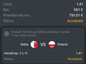 Pico $10k 阶梯挑战 🪜 $100 → $10,000 | 第3天(第3步) $561 → $791 🌍 世界杯资格赛 🇲🇹 马耳他 vs 波兰 波兰 -1 @ 1.41 ➡️ 0-1 = 全额退款 ➡️ 0-2+ = 我们全赢 如果你在 𝗧𝗔𝗜𝗟𝗜𝗡𝗚,点击 𝗙𝗢𝗟𝗟𝗢𝗪 🔒